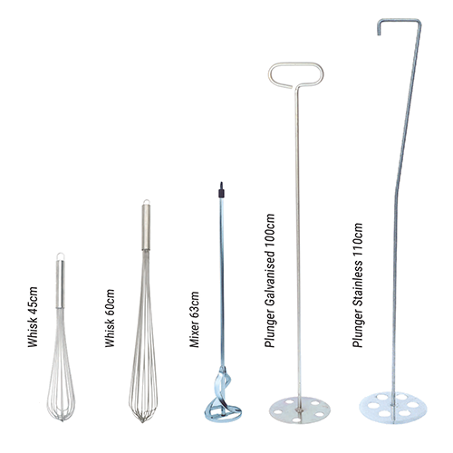 Galvanised steel plunger, 100cm long, with 17cm disc diameter. Mixes milk powder in larger containers effortlessly. Traditional and simple.
